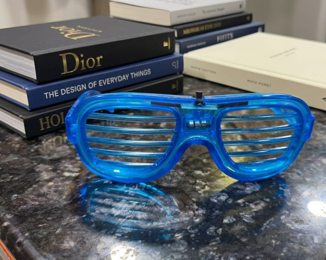 Light up the night with these vibrant blue LED shutter shades. Designed with the classic slatted “shutter” look, these glasses feature built-in LED lights powered by a small battery pack for a long-lasting glow. Perfect for concerts, festivals, neon parties, and nighttime events, they are lightweight, comfortable to wear, and guaranteed to make you stand out in any crowd.