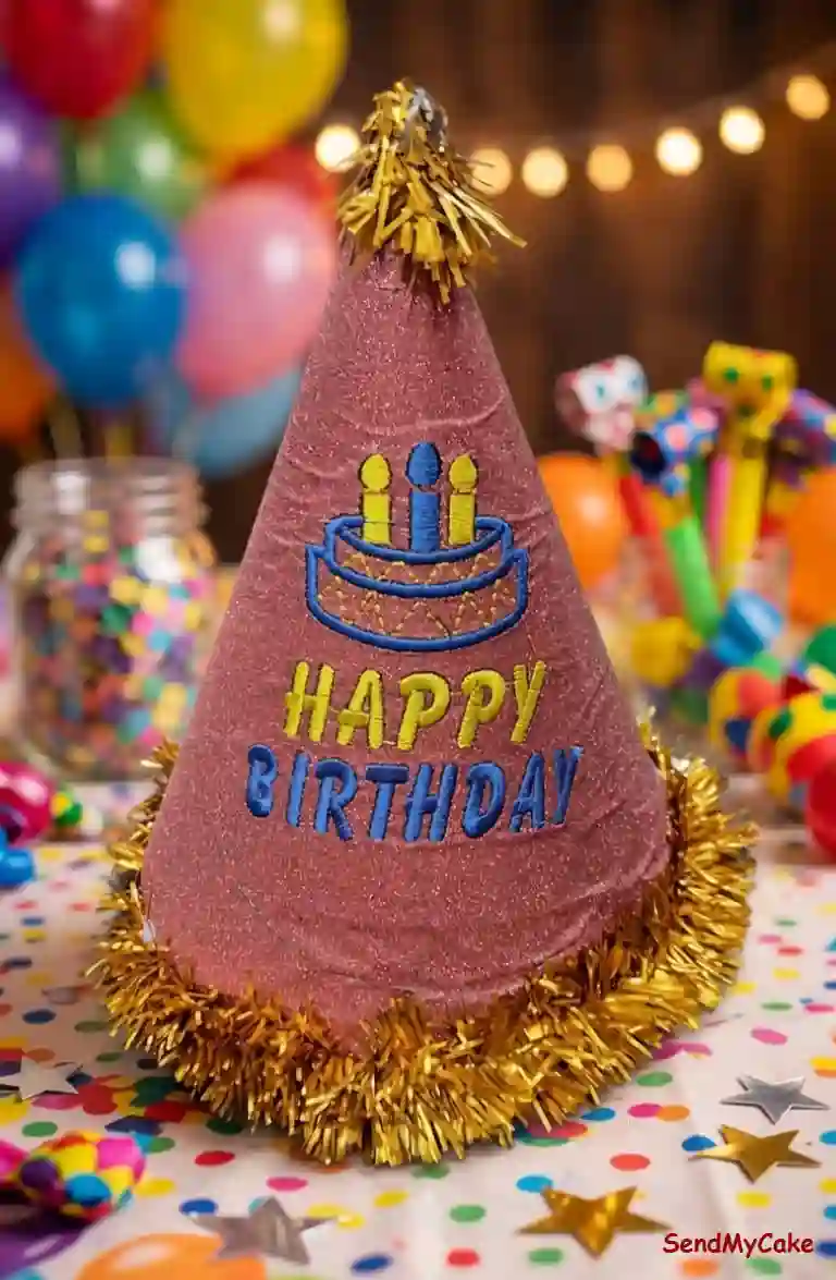 Add a touch of sparkle to any birthday celebration with this premium glittery party hat. Featuring a soft rose pink glitter finish, the cap is embroidered with a colorful “Happy Birthday” message and a cute birthday cake graphic. The base is lined with a festive golden tinsel fringe for extra flair, making it the perfect accessory for the guest of honor. Made from durable, lightweight materials, it includes an elastic chin strap for a comfortable and secure fit throughout the party.