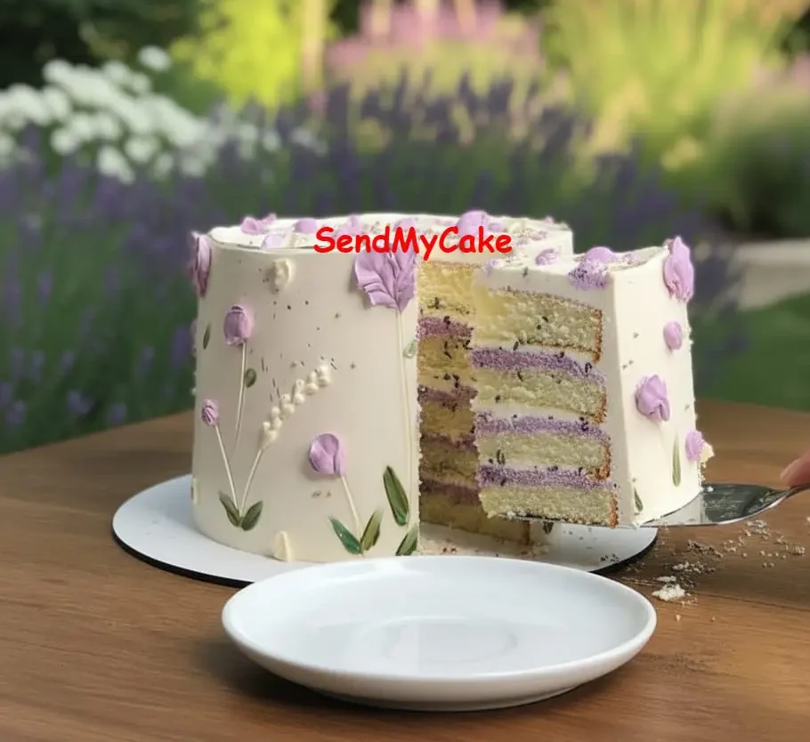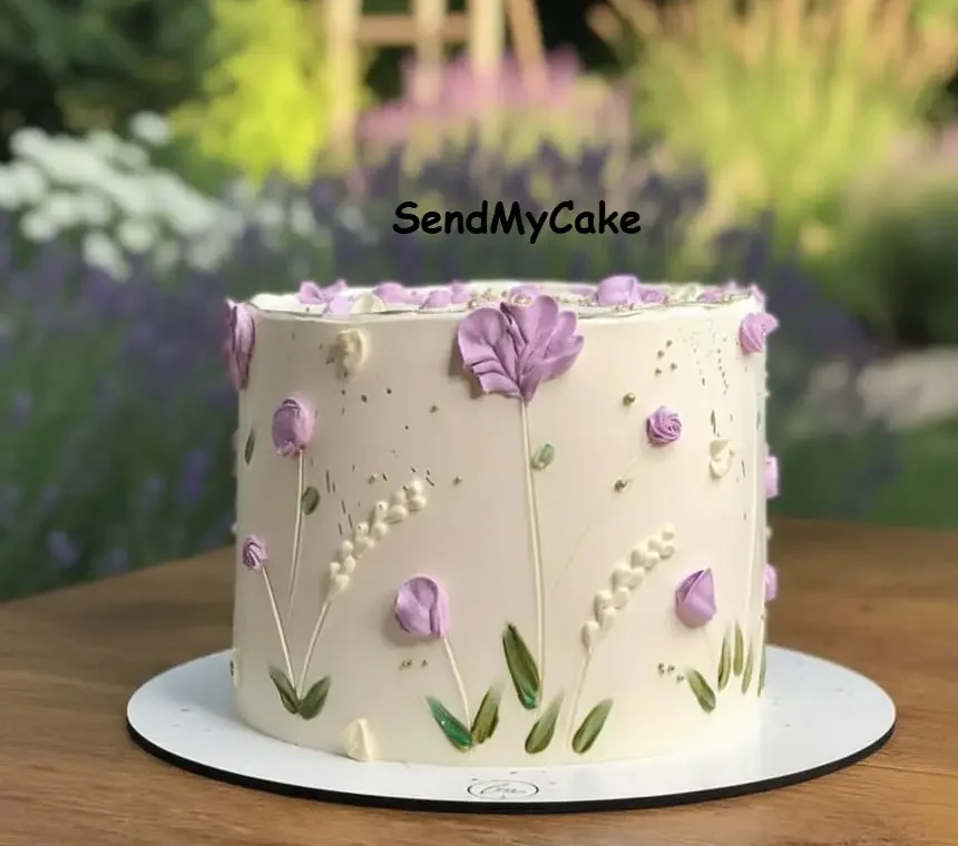 This artistic single-tier cake features a smooth off-white cream base, beautifully hand-painted with delicate lavender-colored petals and greenery. Textured buttercream accents create a whimsical meadow effect, making it a perfect choice for elegant birthdays, garden parties, or intimate celebrations. This 100% eggless cake is baked fresh to order and provides a sophisticated, minimalist aesthetic.