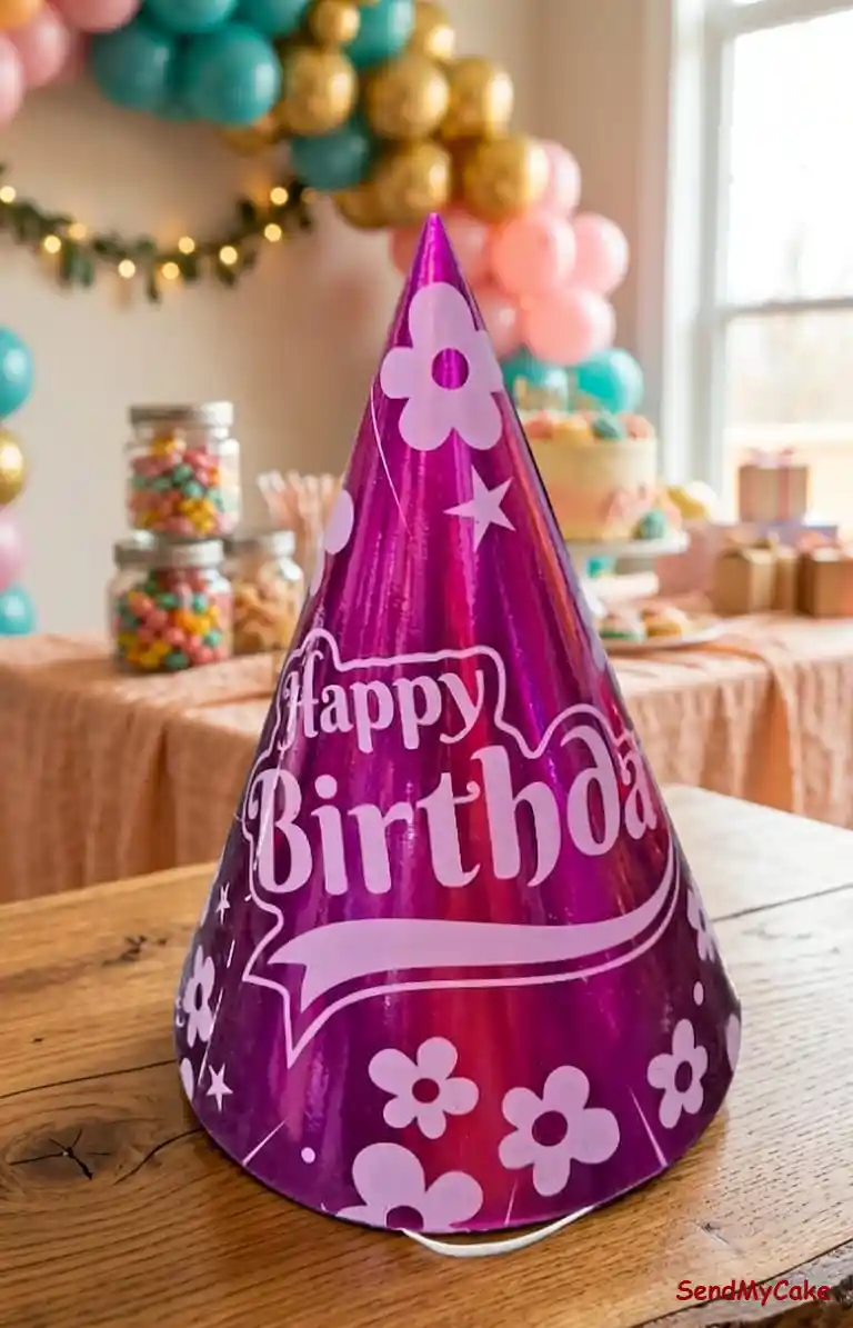 Make the birthday star shine with this vibrant metallic purple party hat. Featuring a glossy, reflective finish, the cap is decorated with white floral motifs, stars, and a bold “Happy Birthday” script. It is crafted from lightweight, high-quality cardstock with a comfortable elastic chin strap to ensure it stays in place during all the cake-cutting and celebration fun. A perfect accessory for kids and adults alike to add a pop of color to birthday photos.