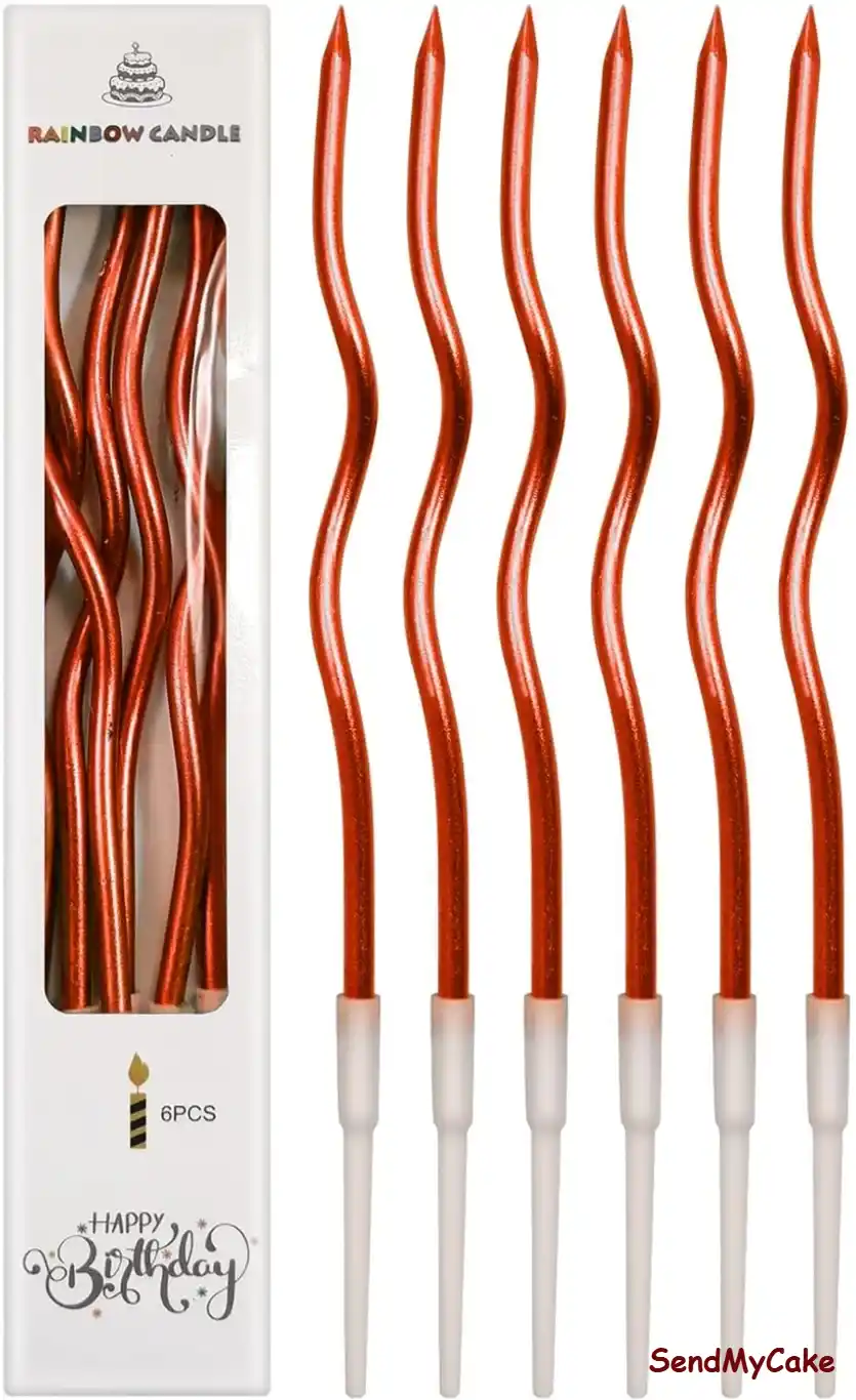 Add a bold pop of color to your dessert with these vibrant metallic red curly candles. This set features six slender, wavy-shaped candles with a high-shine finish, each equipped with a white plastic holder for easy and secure placement. Their playful spiral silhouette provides a modern alternative to standard candles, making them an eye-catching choice for birthdays, holidays, or themed parties.