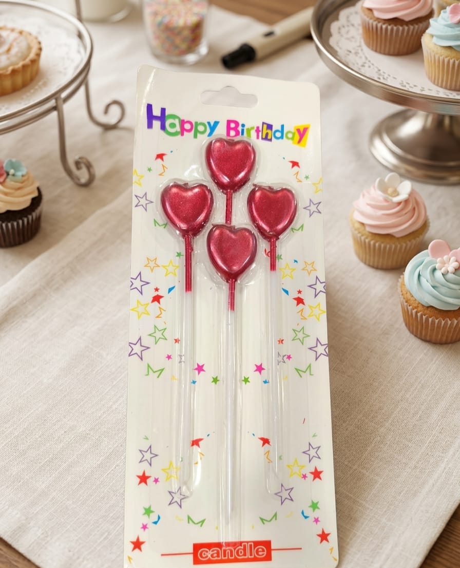 Infuse your celebration with love using these vibrant metallic red heart-shaped candles. This 4-piece set features elegant 3D heart designs with a glossy metallic finish, mounted on long, sturdy sticks for a premium look. Ideal for birthdays, anniversaries, or Valentine’s Day, these candles provide a clean burn and a touch of romantic flair. Their deep red hue stands out beautifully against any frosting, making them a must-have for special milestone cakes.