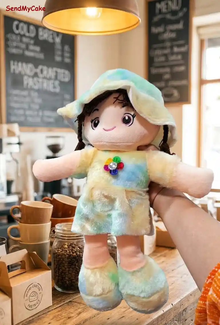 This charming plush rag doll features a beautiful pastel tie-dye pattern in soft shades of blue, yellow, and green. Standing at a height of 30 cm and a width of 20 cm, she comes dressed in a cozy, fuzzy dress adorned with a vibrant multi-colored flower at the center. The ensemble is completed with a matching wide-brimmed sun hat and cute braided hair. Crafted with soft, high-quality materials and friendly embroidered facial features, this doll is a delightful companion for imaginative play or as a decorative nursery piece.