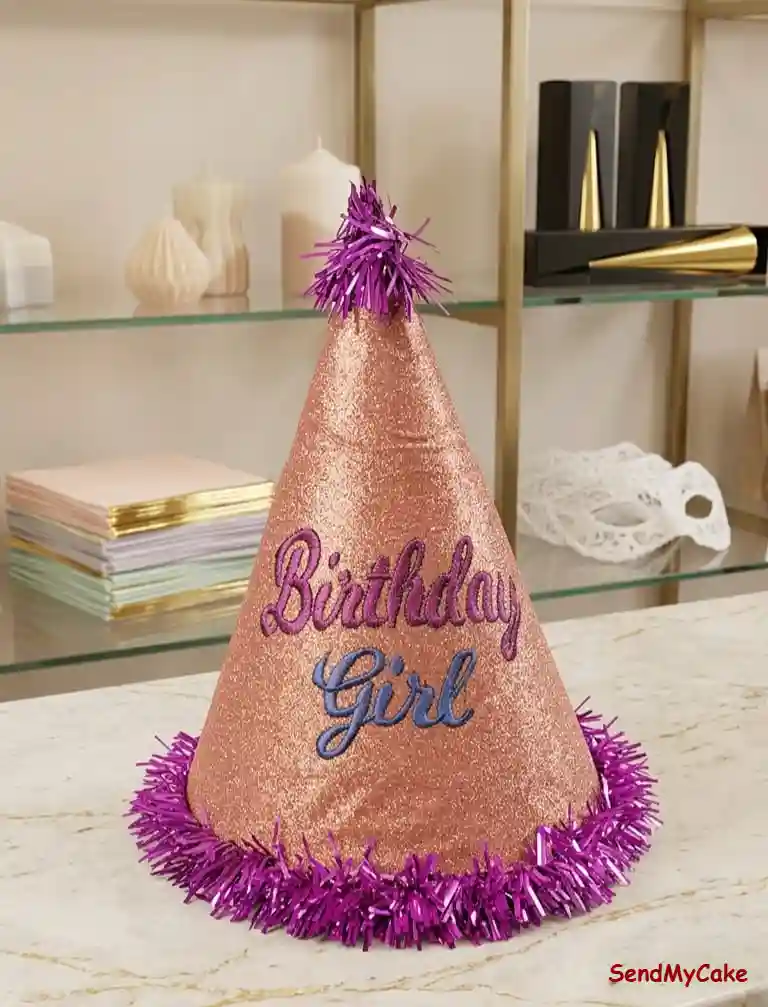 Make the birthday star shine with this premium rose gold glitter party hat. Featuring a bold “Birthday Girl” embroidered script in elegant purple and blue tones, this cone-shaped hat is accented with vibrant purple tinsel trim at the base and a matching pom-pom topper. It’s the perfect high-quality accessory for photo shoots, cake smashing sessions, or the main birthday celebration. Designed for comfort and style, this single-piece durable hat ensures she stands out on her special day.