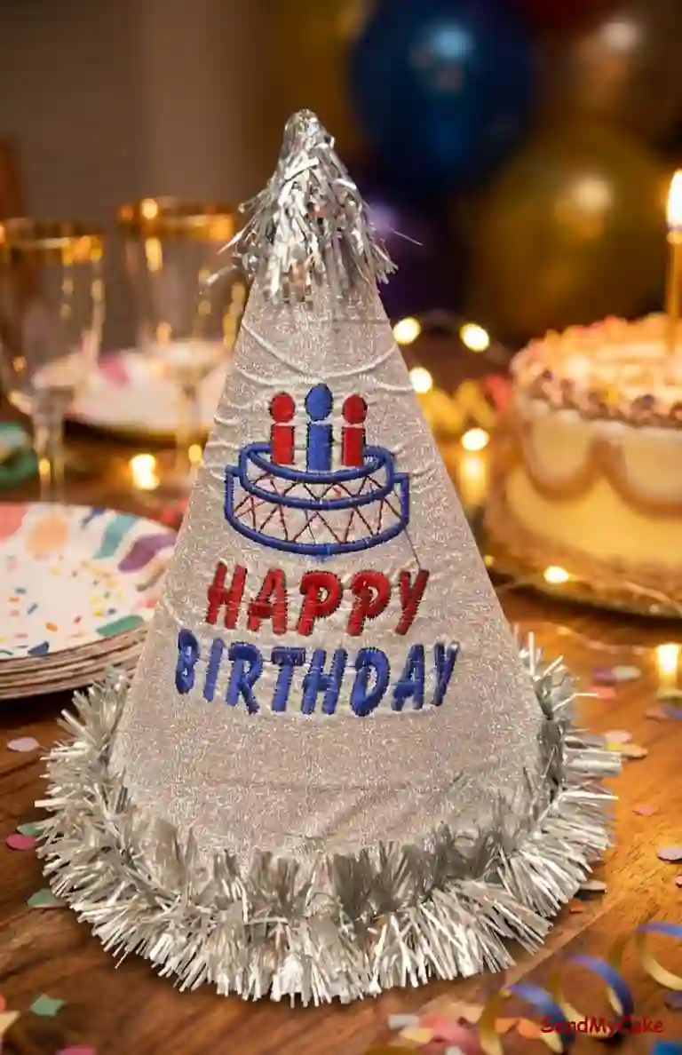 Celebrate in style with this eye-catching silver glitter party hat. This conical cap features a high-shine sparkling finish, adorned with a colorful embroidered birthday cake graphic and bold “HAPPY BIRTHDAY” lettering in red and blue. The base and tip are finished with festive silver tinsel fringe, making it the perfect statement accessory for birthday stars of all ages. Durable, vibrant, and designed to stand out in photos.