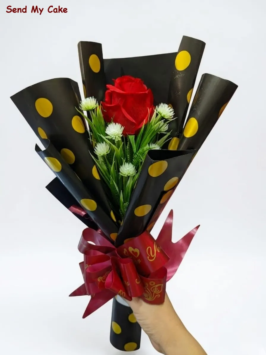 Express your feelings with this elegant and long-lasting artificial floral arrangement. This bouquet features one large, vibrant red rose as the centerpiece, beautifully accented by five delicate white globose filler flowers and lush green foliage. The arrangement is uniquely wrapped in premium black paper with gold polka dots and finished with a decorative red “I Love You” ribbon. Standing at 45 cm tall, it is a perfect maintenance-free gift for any special occasion.