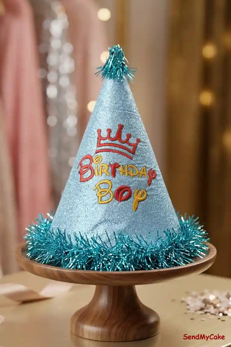 Make his special day unforgettable with this premium sky blue glitter party hat. This cone-shaped cap features a sparkling textured finish, decorated with a vibrant red embroidered crown and bold “Birthday Boy” lettering in red and gold. The base and tip are accented with plush teal tinsel fringe, providing a festive and high-quality look. Lightweight and durable, it’s designed to stay comfortable throughout the celebration and look fantastic in every birthday photo.
