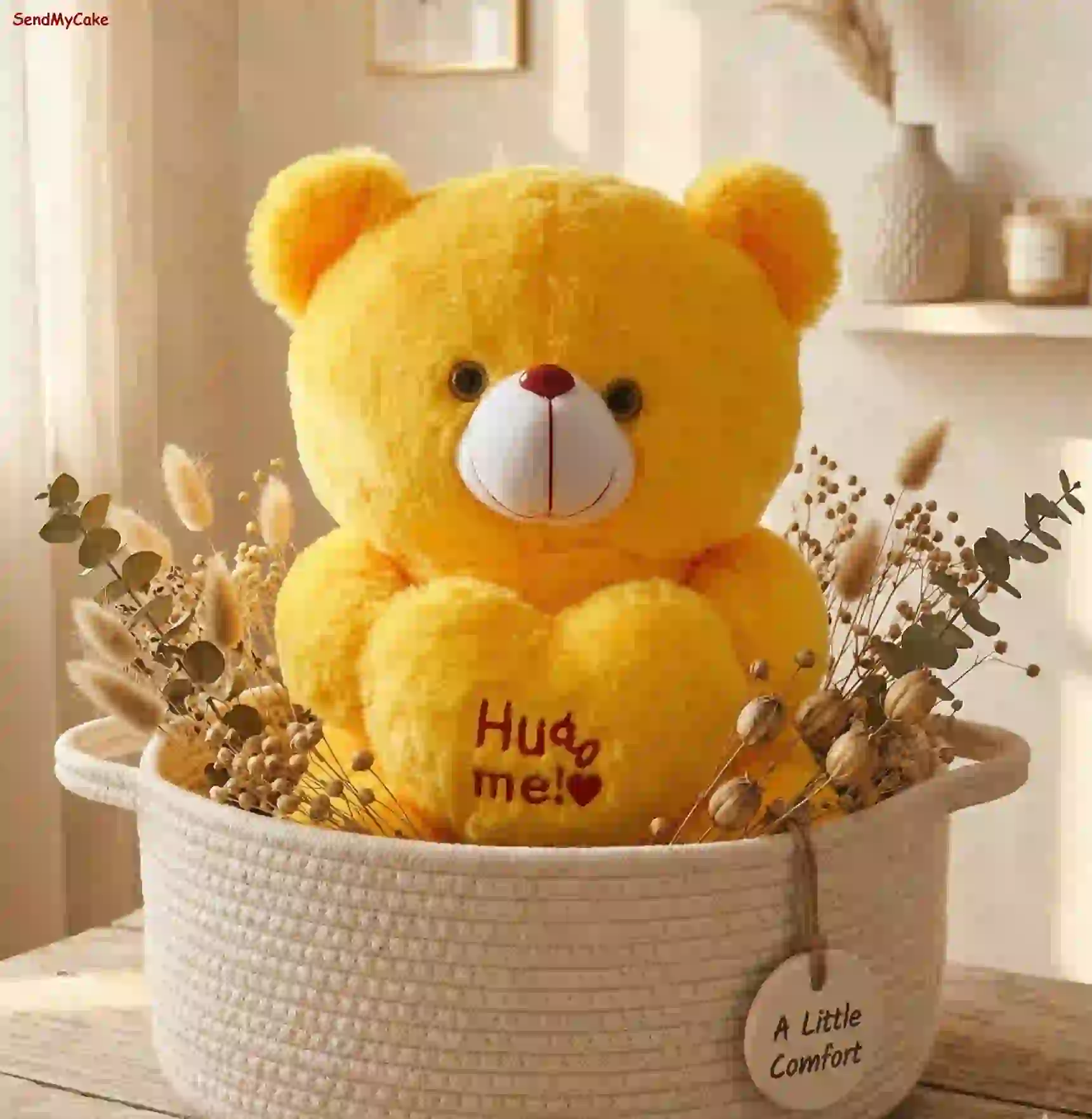 This cheerful, bright yellow teddy bear is designed for maximum snuggles. It features soft, plush fur and holds a matching yellow heart embroidered with the sweet message “Hug Me!”. With a friendly white muzzle and dark expressive eyes, this small teddy bear is a perfect token of affection.